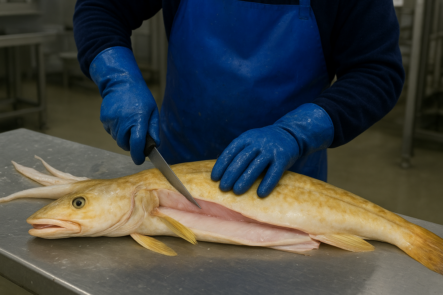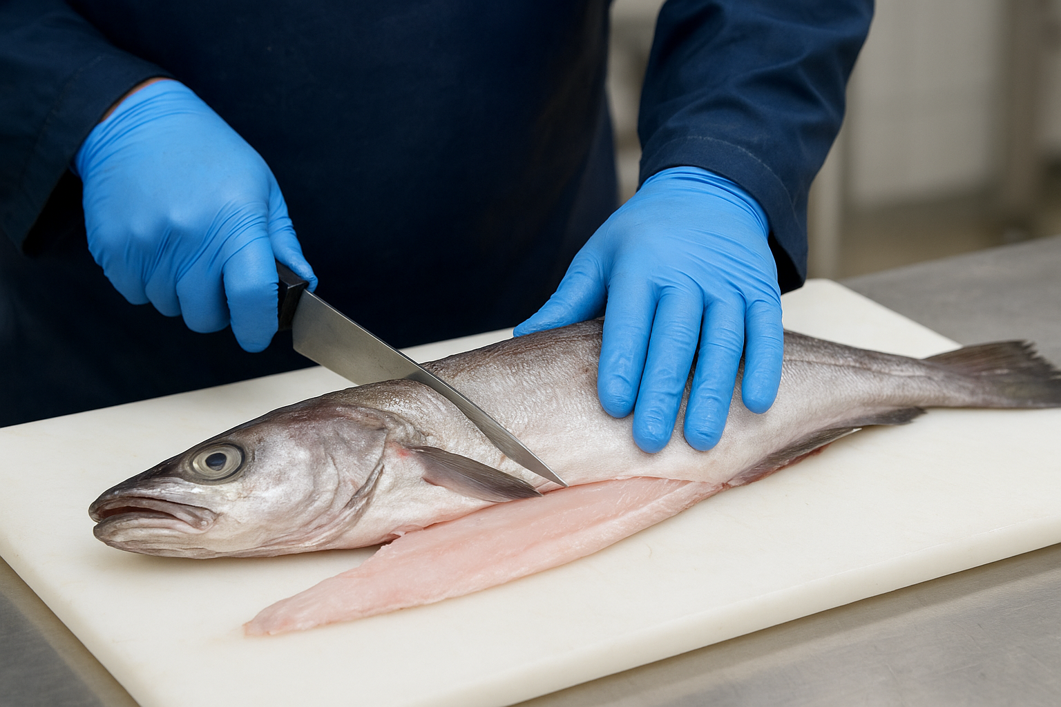Una vez aprobada la materia prima, se procede al fileteado. Este proceso se realiza de manera manual y/o mecanizada, según el tipo de especie, asegurando precisión en los cortes para optimizar el rendimiento. El objetivo es obtener filetes uniformes, sin espinas ni defectos visibles, listos para etapas posteriores de selección y moldeado.